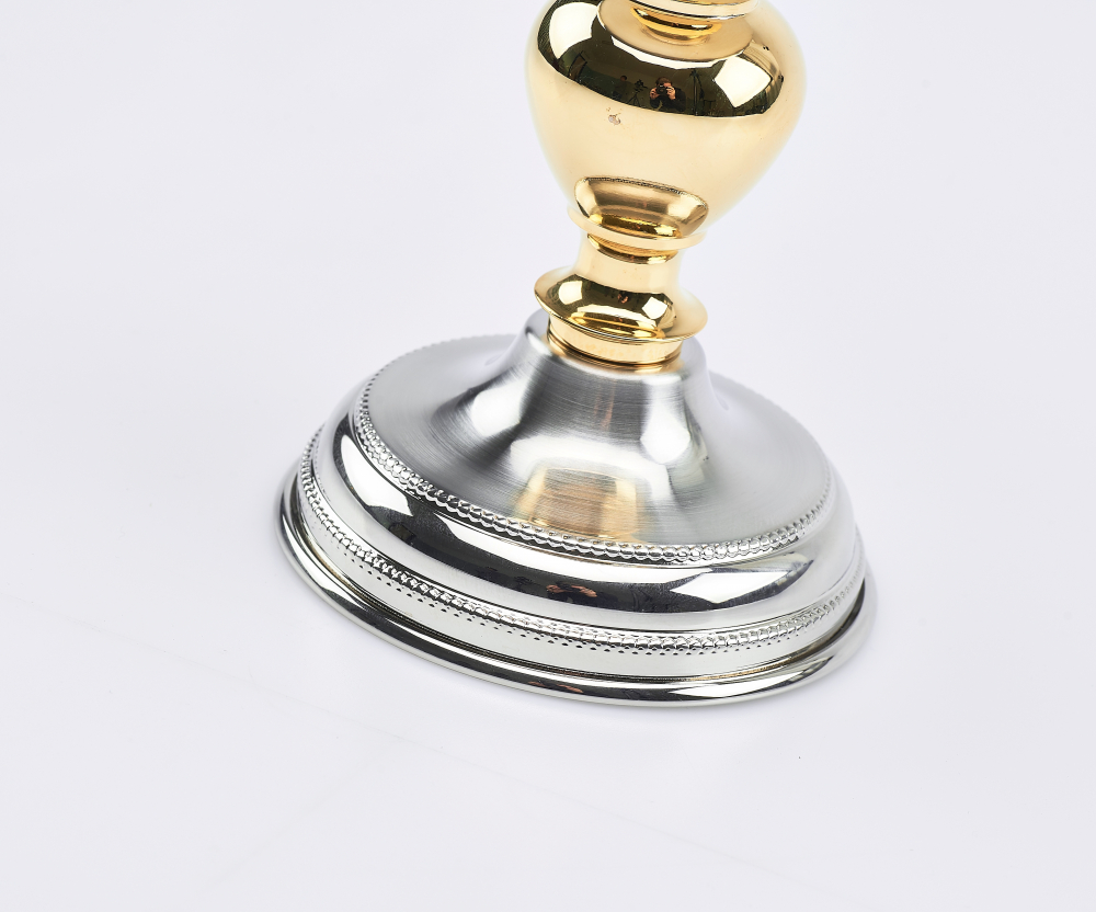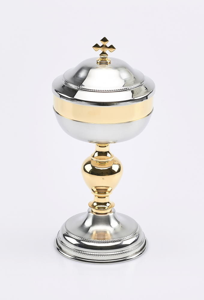 wysokość: 19 cm, średnica: 9,5 cm, pojemność: 90 hostii, materiał: złocony