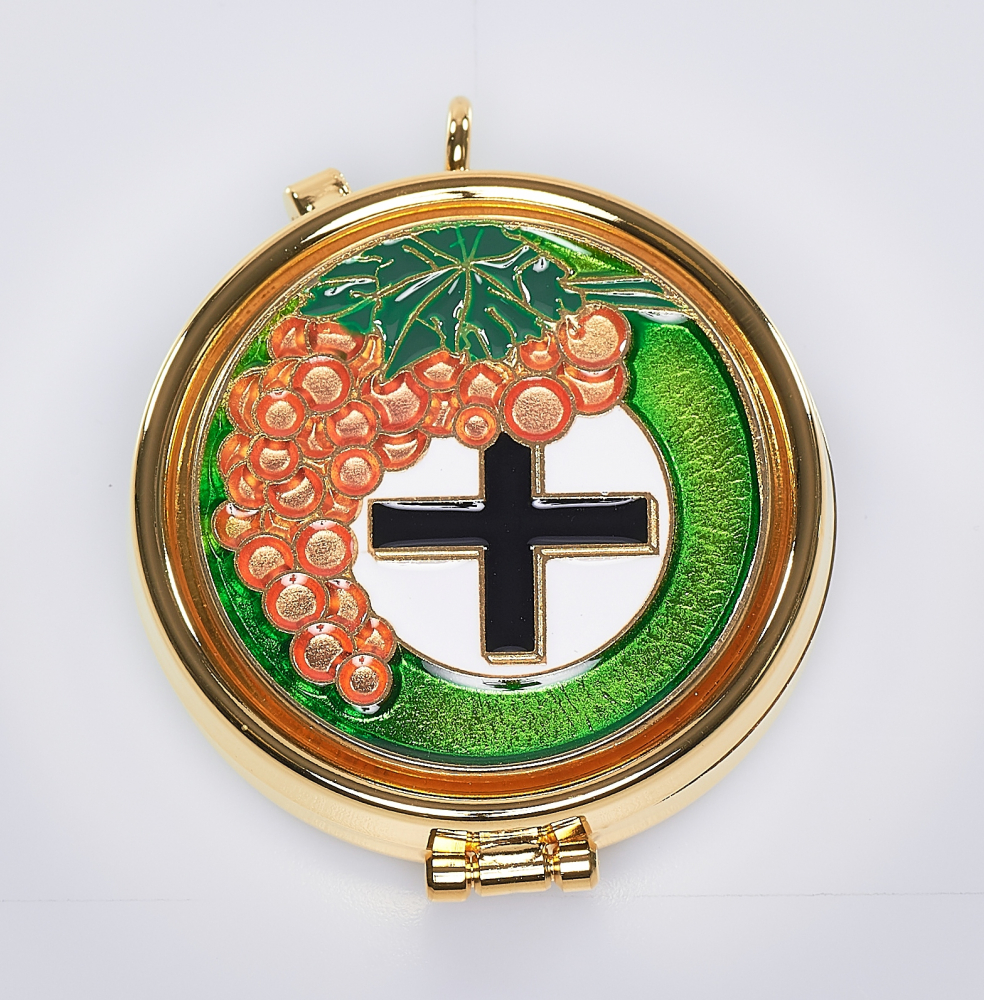 materiał: złocenie, kolorowy medal wykonany jest z niklu. Z motywem winogron i krzyża.