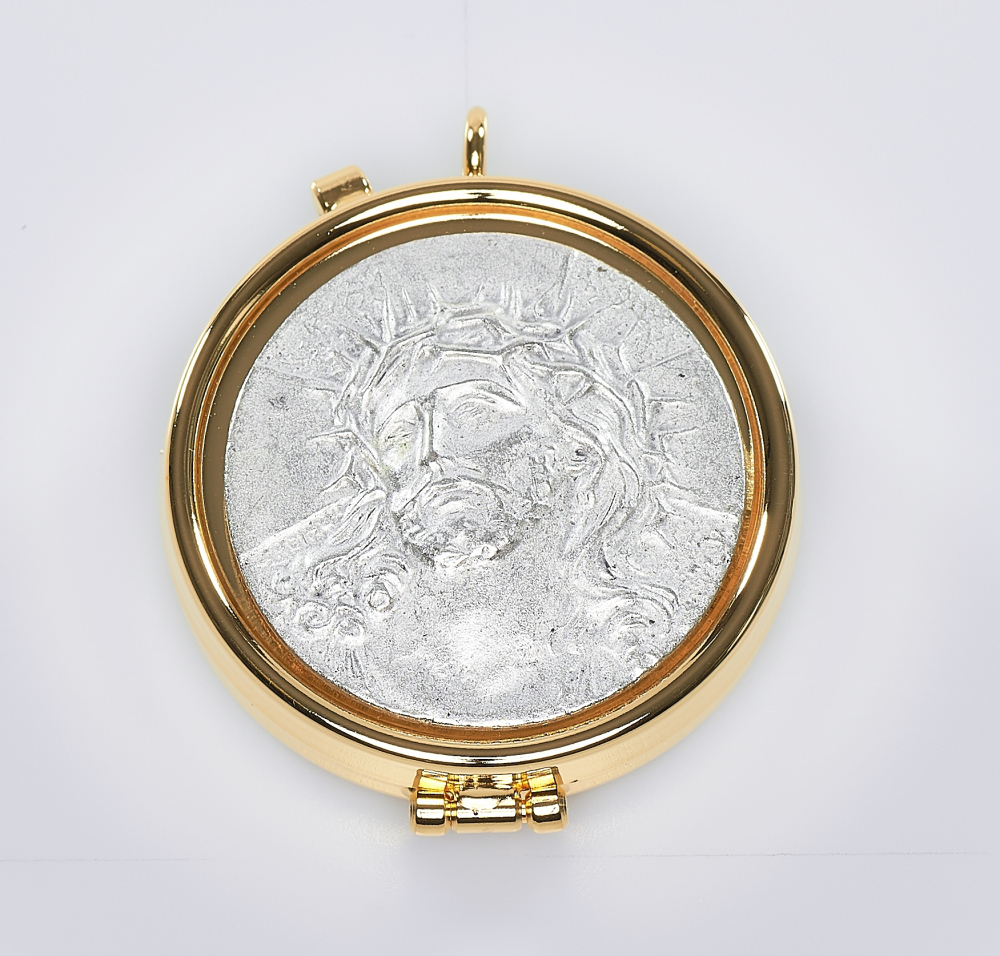 materiał: złocenie, medal wykonany jest z cyny. Z motywem Ecce Homo.