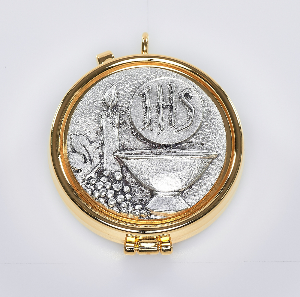 materiał: złocenie, medal wykonany jest z cyny. Ze świecą i motywem JHS.