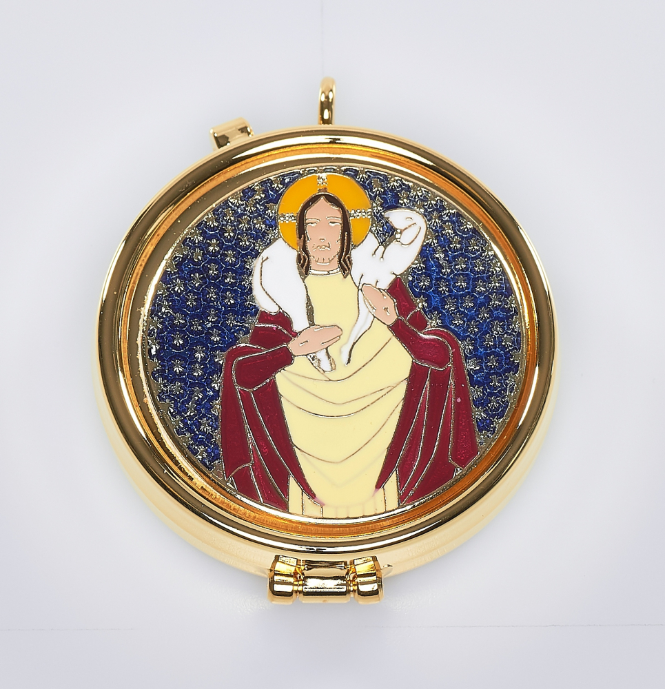 materiał: złocenie, kolorowy medal wykonany jest z niklu. Z motywem Dobrego Pasterza.