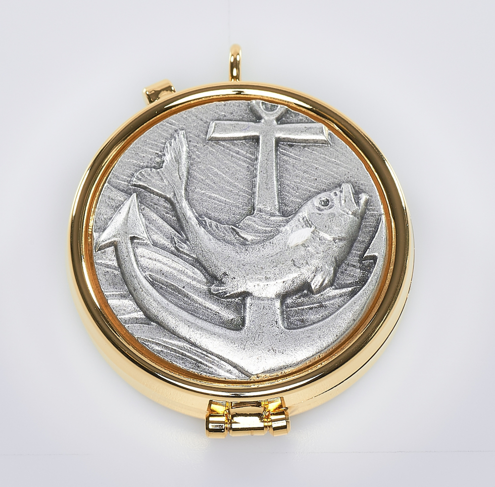 materiał: złocenie, medal wykonany jest z cyny. Z motywem ryby.