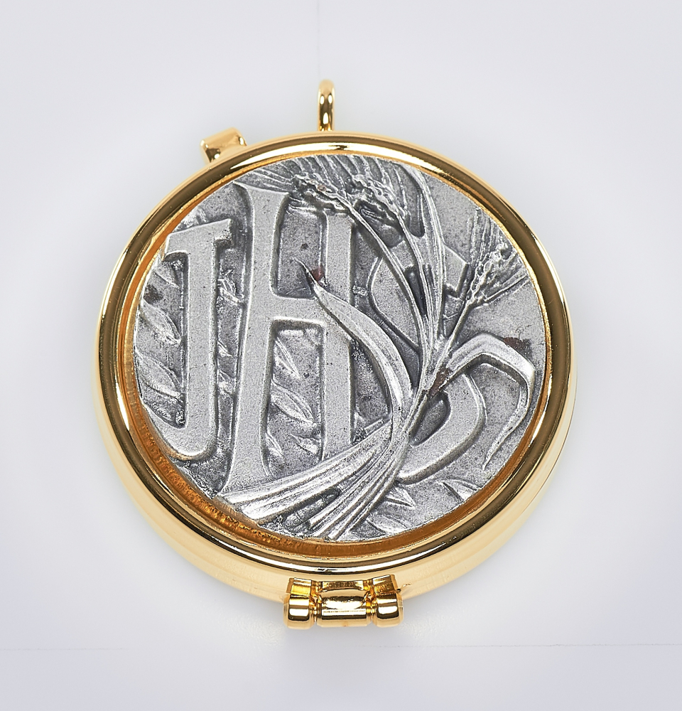 materiał: złocenie, medal wykonany z cyny. Z motywem kłosów pszenicy i JHS.