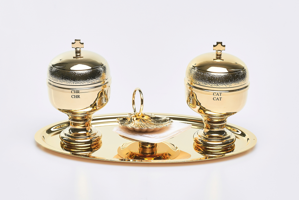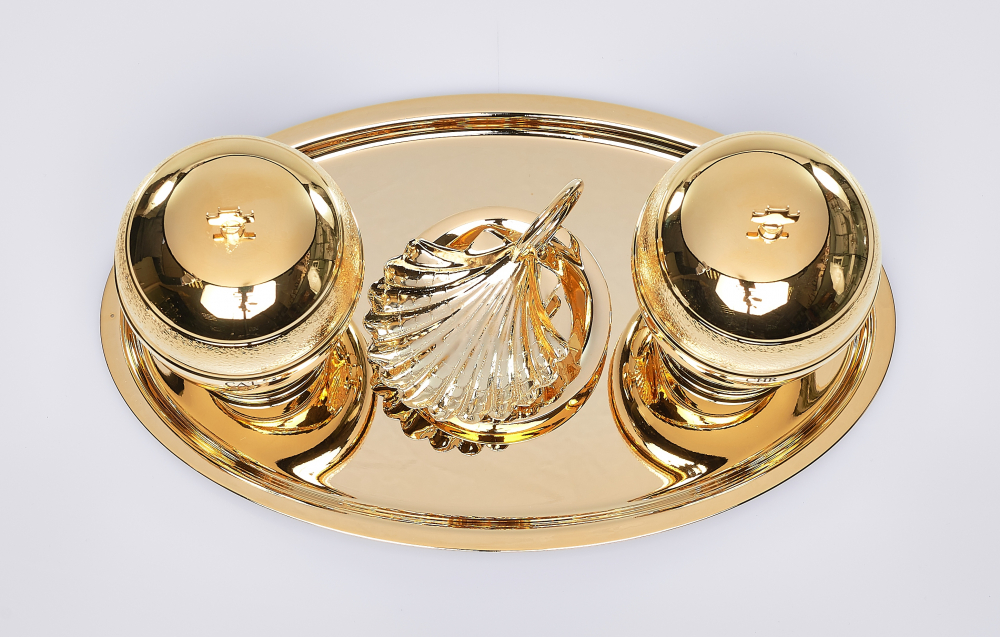 w skład zestawu wchodzi taca, 2 olejki oraz pojemnik do udzielania sakramentu chrztu, materiał: złocony