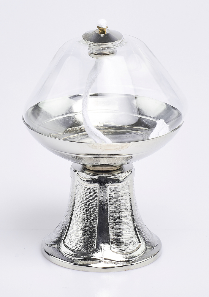 wysokość: 14 cm, średnica: 10 cm, materiał: mosiądz niklowany (podstawa), szkło (lampa), wypełnienie: olej lampowy.