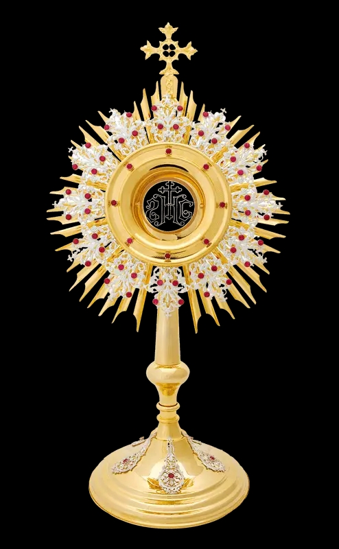 Monstrancja wykonana jest z mosiądzu, pozłacanego. Posrebrzane ozdoby roślinne, zdobione rubinami. Przedni pierścień monstrancji oraz ozdoby podstawy zdobione są rubinami.