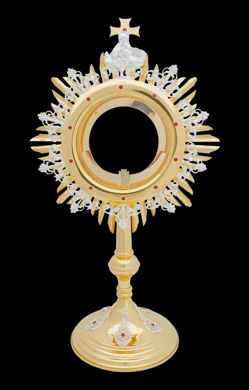 Monstrancja wykonana jest z mosiądzu, pozłacanego. Posrebrzane wizerunki roślin i Boga Ojca. Przedni pierścień monstrancji zdobiony kryształkami