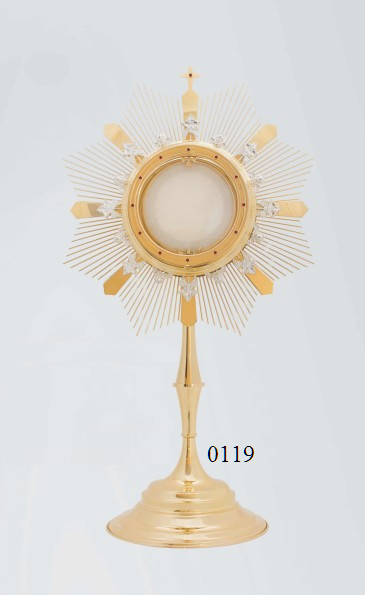 Monstrancja wykonana jest z mosiądzu, pozłacana i ozdobiona rubinami.