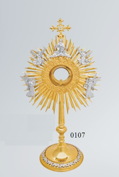 Monstrancja wykonana jest z mosiądzu i pozłacana. Ozdoby są posrebrzane.