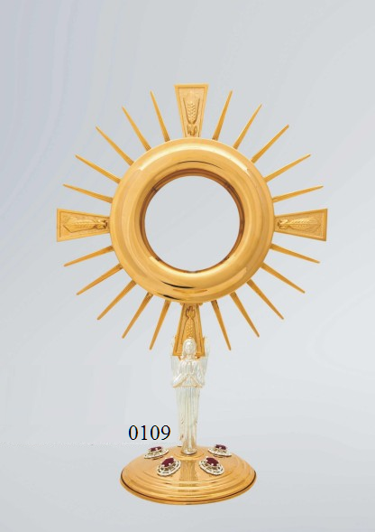Monstrancja wykonana jest z mosiądzu i pozłacana. Ozdobiona jest rubinami, a ozdoby są posrebrzane.