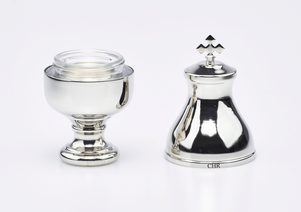 wysokość: 15 cm, średnica pojemnika: 6,5 cm, pojemność: 50 ml, wykończenie w kolorze srebrnym, pojemnik zawiera szklane wnętrze