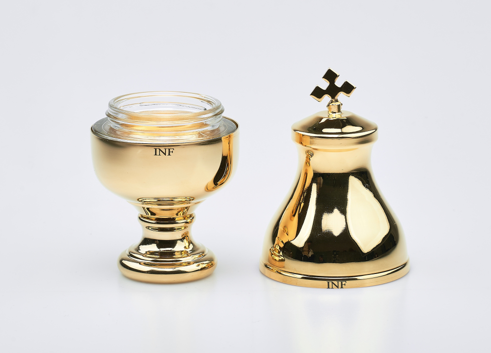 wysokość: 15 cm, średnica pojemnika: 6,5 cm, pojemność: 50 ml, wykończenie w kolorze złotym, pojemnik zawiera szklane wnętrze