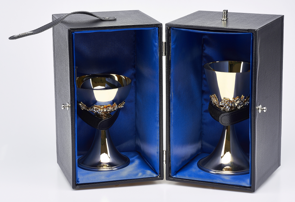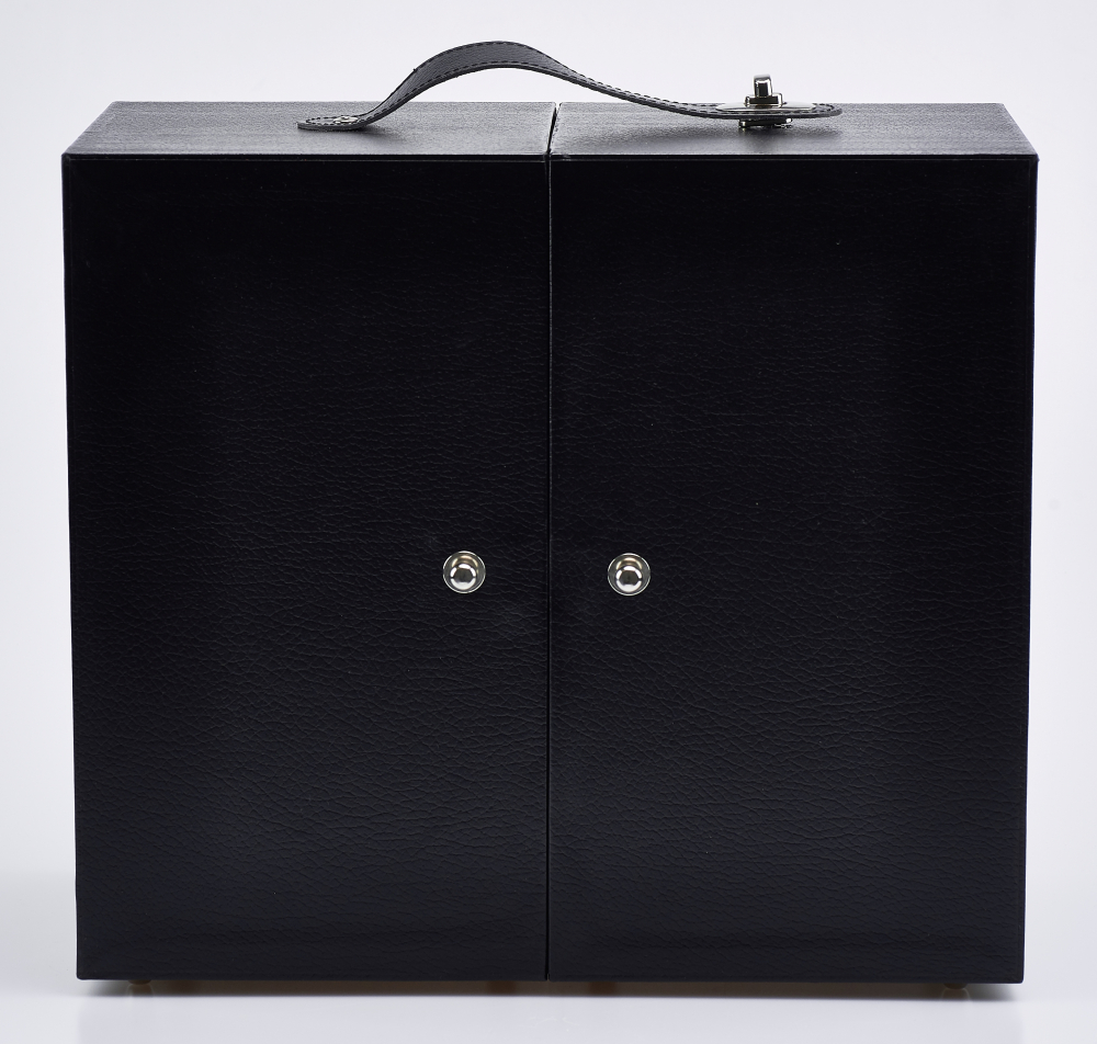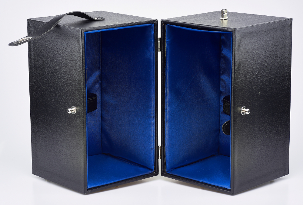 materiał: drewno, pokryte skórą naturalną, wnętrze wyściełane niebieskim satyną. Nadaje się do kielichów i puszek o średnicy do 14 cm i wysokości do 28 cm.