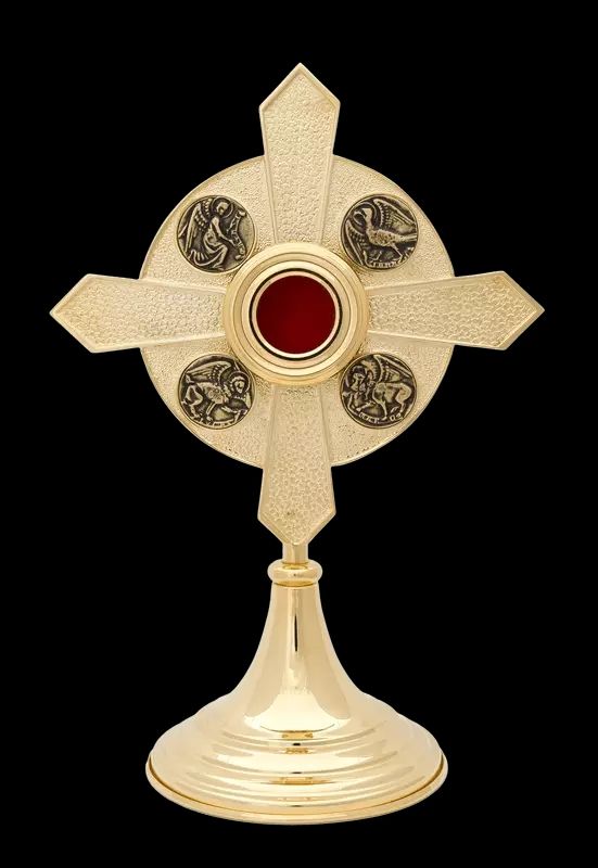 relikwiarz w kształcie krzyża wykonany z mosiądzu, złocony