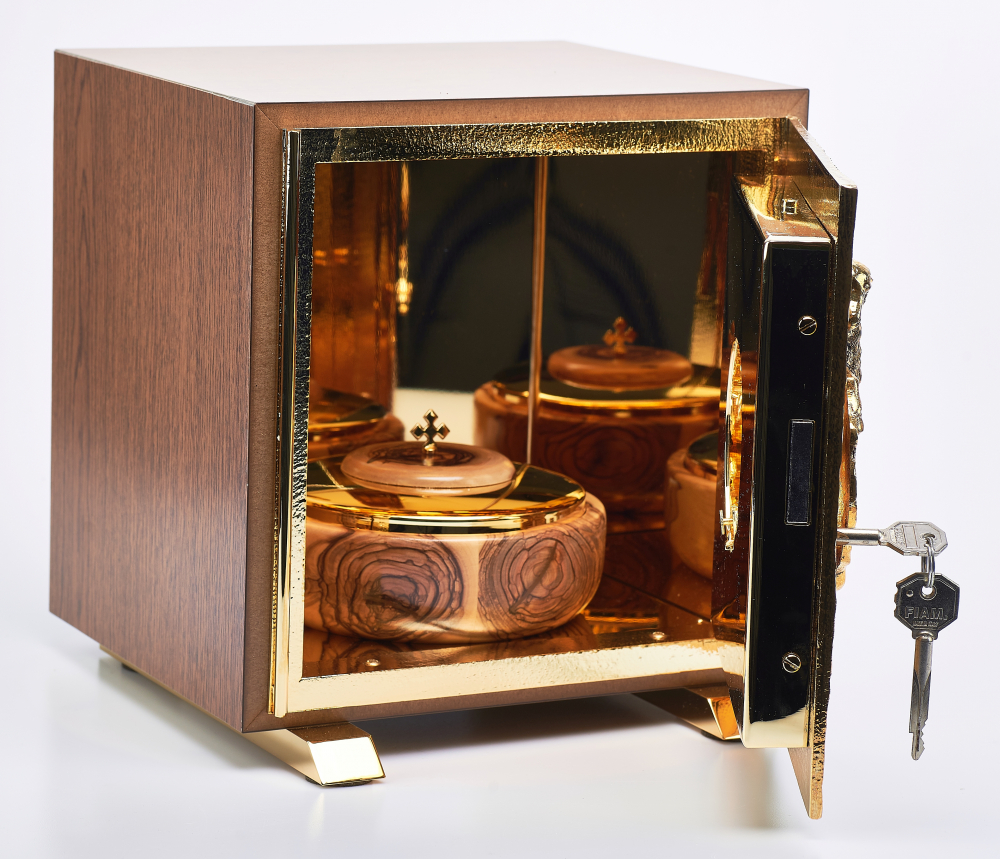 Otwory są pokryte 24-karatowym złotem. Z dekoracją przedstawiającą baranka. Tabernakulum dostępne jest w różnych opcjach kolorystycznych.
