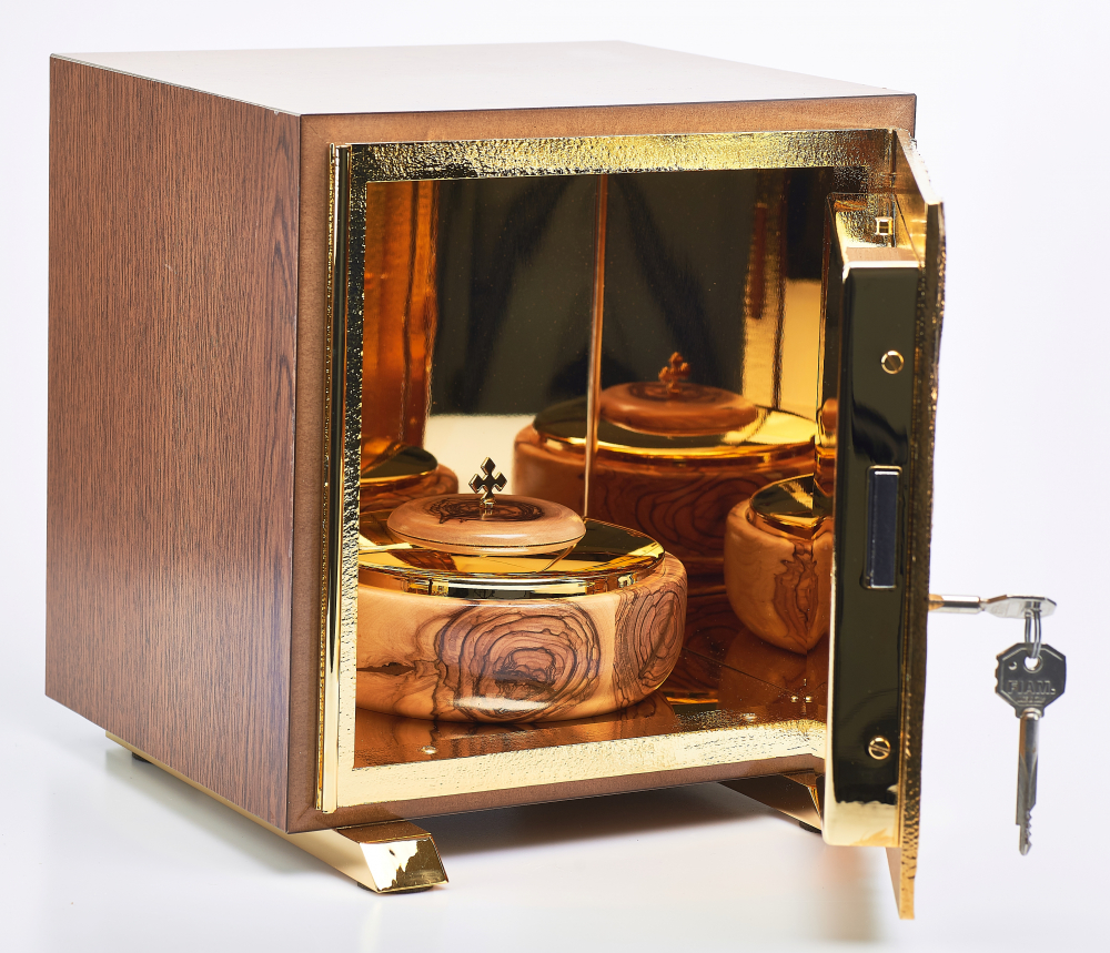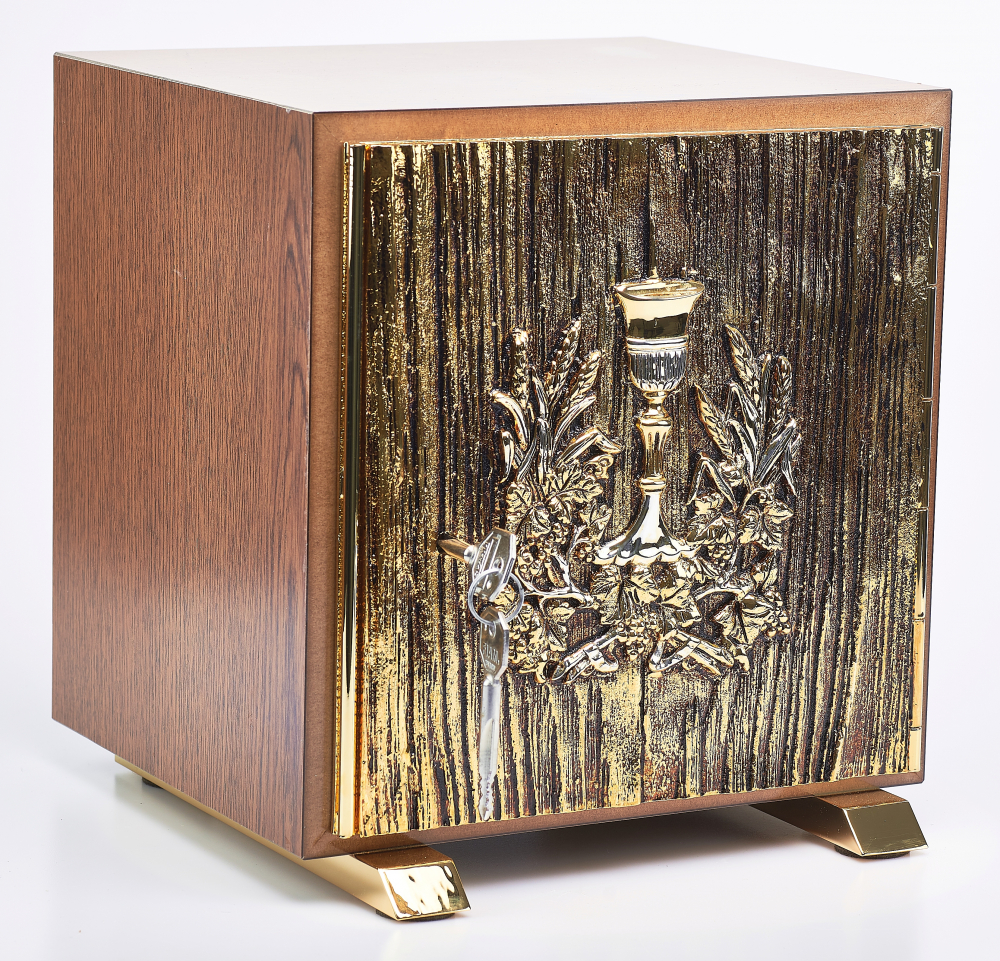 Otwory są pokryte 24-karatowym złotem. Z dekoracją kielicha. Tabernakulum dostępne jest w różnych opcjach kolorystycznych.