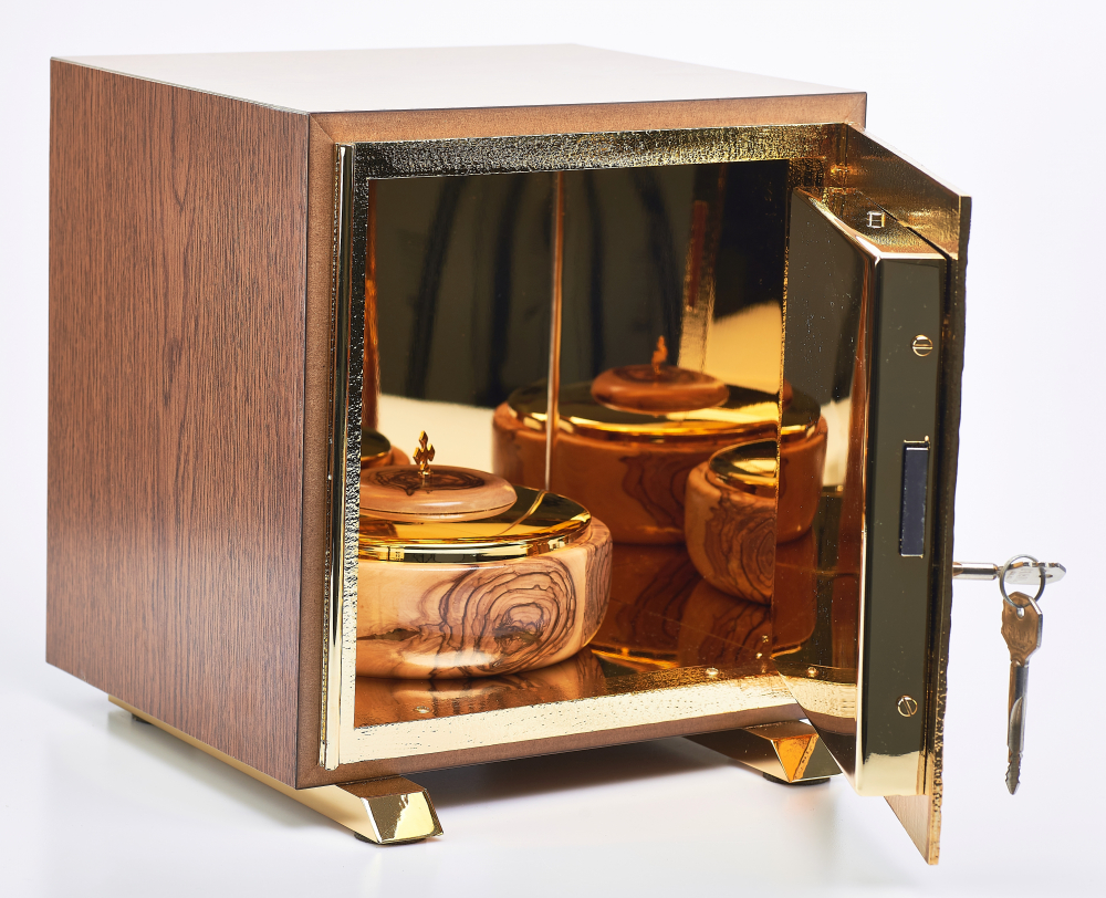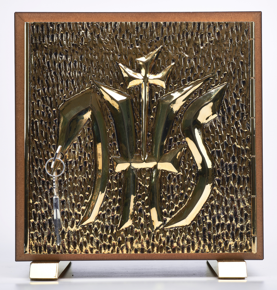 Otwory są pokryte 24-karatowym złotem. Z dekoracją JHS. Tabernakulum dostępne jest w różnych opcjach kolorystycznych.