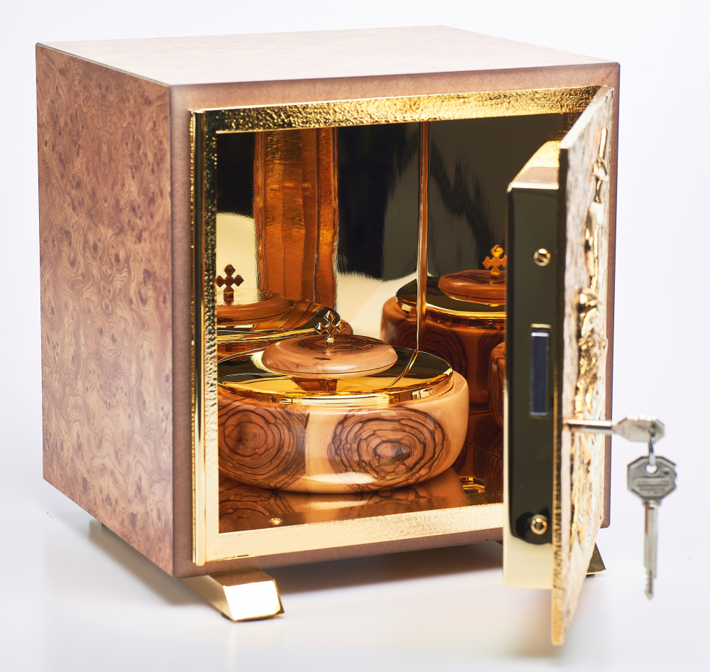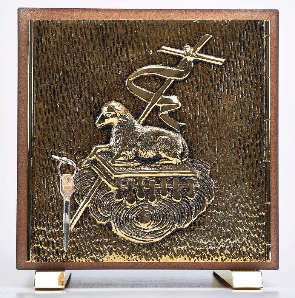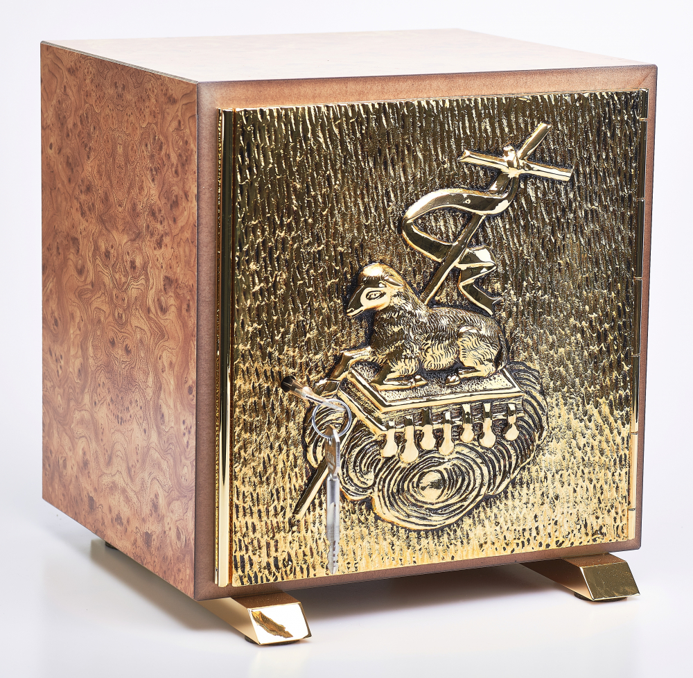 Otwory są pokryte 24-karatowym złotem. Z dekoracją przedstawiającą baranka. Tabernakulum dostępne jest w różnych opcjach kolorystycznych.