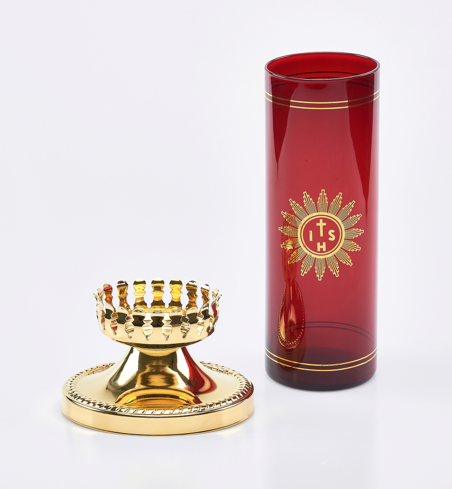 wysokość: 20 cm (abażur), 7,5 cm (podstawa), średnica: 7,8 cm (abażur), 13 cm (podstawa), materiał: pozłacany (podstawa), szkło (abażur)