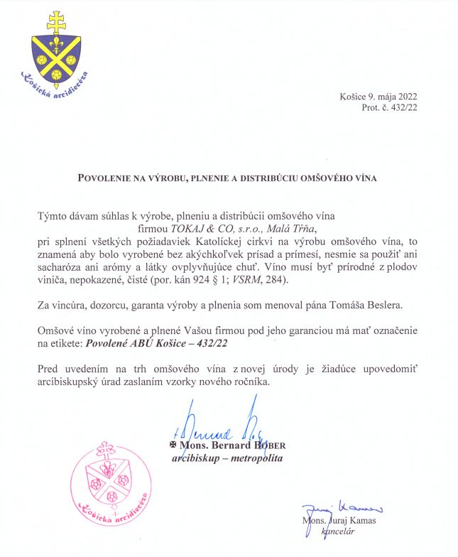 Wysokiej jakości markowe wino półsłodkie produkowane przy użyciu specjalnej, ściśle określonej technologii opartej na naturalnych zasadach, z gwarancją dojrzałości winogron, gdzie w procesie produkcji dopuszcza się jedynie ingerencję fizyczną. Podstawą są tokajskie odmiany Furmint i Lipovina. Ze względu na swoją naturalną naturę, wino to wykorzystywane jest nie tylko w celach religijnych, ale również przez miłośników wina, którzy pragną umilić sobie wolny czas. Moszczu i wina nie wolno dosładzać ani w żaden inny sposób modyfikować. Dlatego do produkcji wykorzystuje się winogrona, które dojrzały i osiągnęły odpowiednią słodycz. Jest on bardzo poszukiwany ze względu na swoją wyłącznie naturalną naturę. Ma całkowicie żółty kolor. Aromat owocowy, z subtelną nutą tokajską. Harmonijne, z pikantnymi i miętowymi taninami. Wino o harmonijnym smaku z korzennym i miętowym posmakiem. Podaje się je z makaronem, sałatkami warzywnymi i daniami z ryżem. Nadaje się również do deserów, ciast i serów.